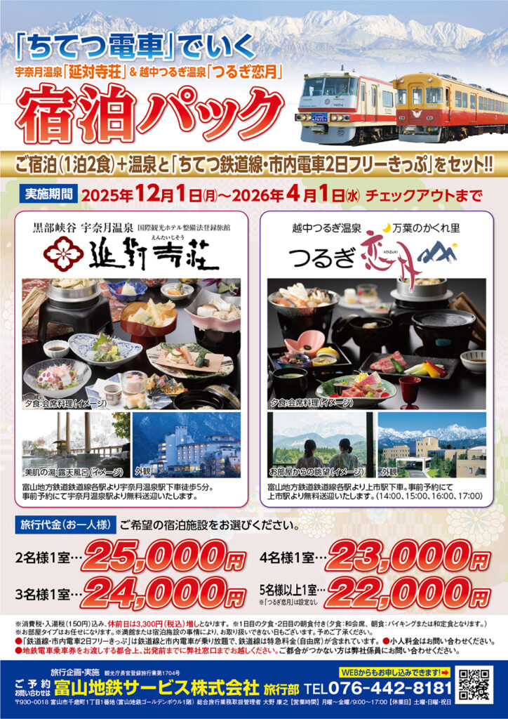 温泉旅館1泊(2食付)と富山地方鉄道の鉄道線と市内電車が2日間乗り放題のフリー切符をセットにした宿泊パックをご紹介します。これからの寒い時期、温かい温泉でゆったりくつろぎ、フリー切符をフルに活用して、富山のまちなかや岩瀬方面をお楽しみいただけるお得なプランです。