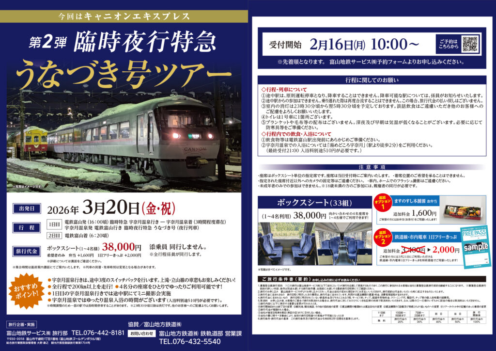 第2弾臨時夜行特急うなづき号ツアー運行!2月16日(月)10時より予約を開始いたします!